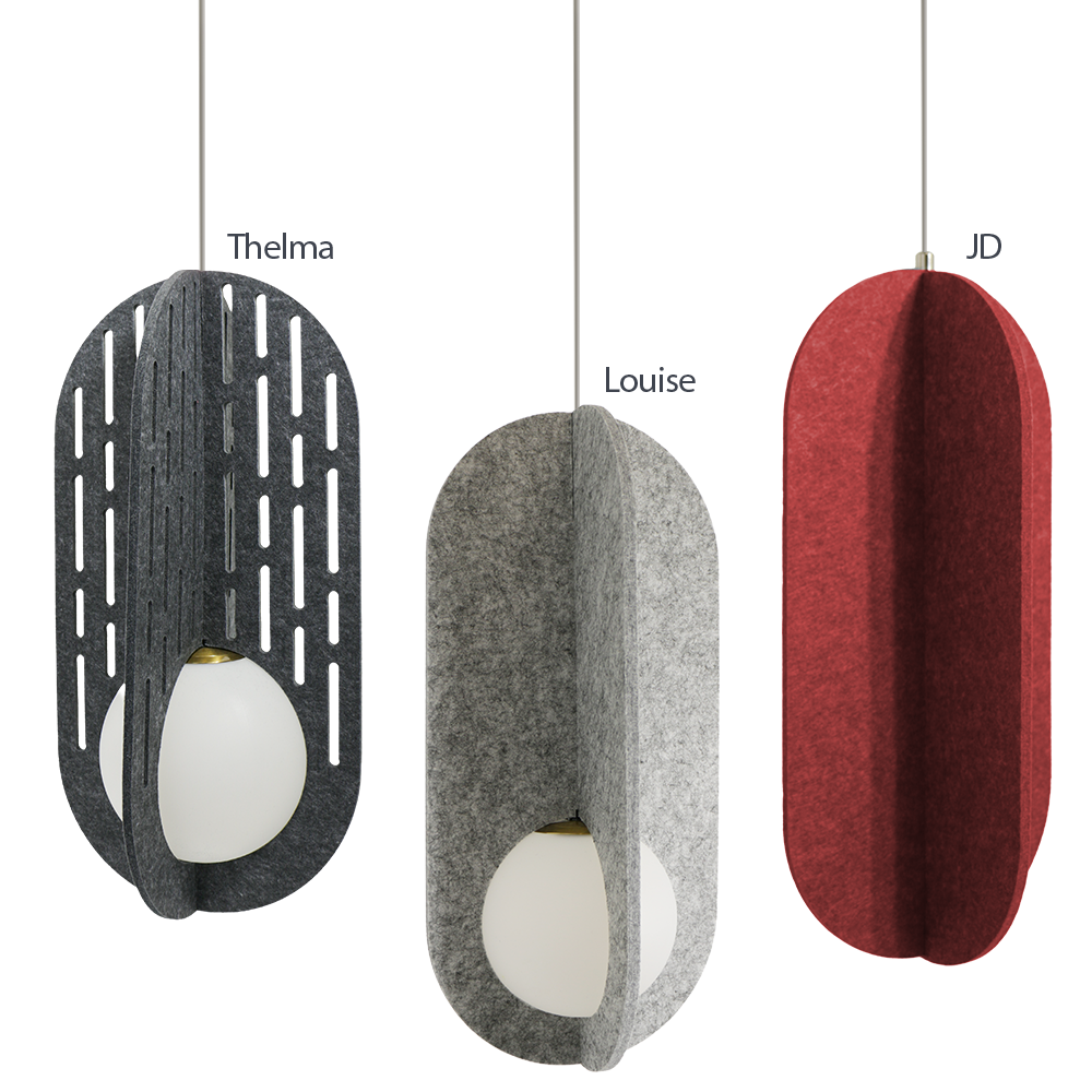 Thelma & Louise are pendant lights that embody bold design and acoustic performance, each offering its own unique take on form while complementing one another as a pair. For added aesthetics our JD accessory comes in 5 colours, designed with the same high performance acoustic material. Thelma features precision-cut slotted panels for a structured, graphic look, while Louise offers smooth, curved surfaces for a softer, sculptural presence. Together, they create a versatile lighting solution that enhances both visual and acoustic comfort in modern workspaces, lounges, and hospitality interiors. Each pendant houses a globe diffuser that delivers a warm, ambient glow, balancing bold exterior design with soft internal illumination. With sustainable construction and a timeless palette, Thelma & Louise are designed to work beautifully side by side-or as standalone features.